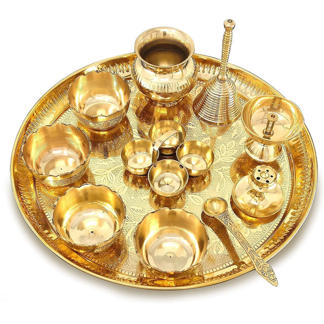 NOBILITY Brass Pooja Thali Set 12 Inch with Pital Puja Plate Kalash Bowl Spoon Haldi Kumkum Stand Ghanti Piyali Diya Arti Thali for Diwali Home Office Mandir Wedding Return Gift Items
