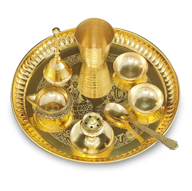 - π Nobility Pooja Thali Set in Pure Brass consists of an intricately designed Pooja plate, as well as, an assortment of their items necessary for performing various religious rites during auspicious occasions