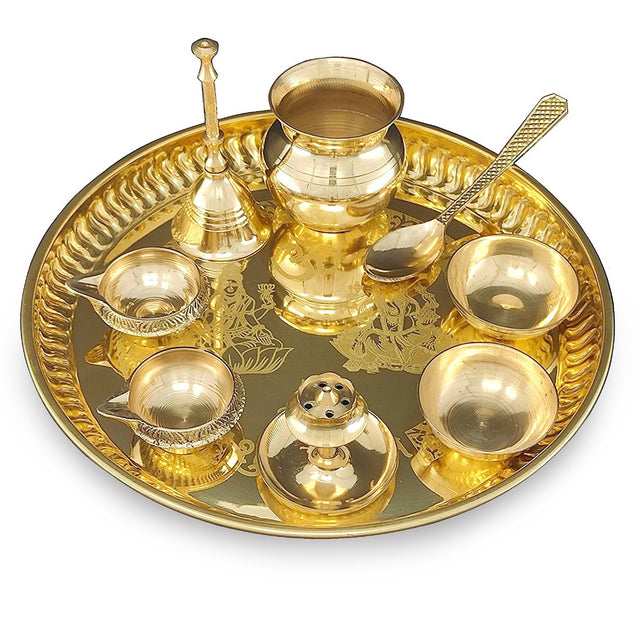 - π Nobility Pooja Thali Set in Pure Brass consists of an intricately designed Pooja plate, as well as, an assortment of their items necessary for performing various religious rites during auspicious occasions