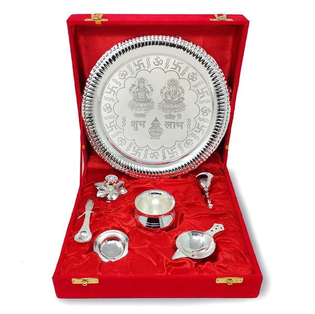 - π Nobility Pooja Thali Set with Gift Box in Silver Plated consists of an intricately designed Pooja plate, as well as, an assortment of items necessary for performing various religious rites during auspicious occasions.