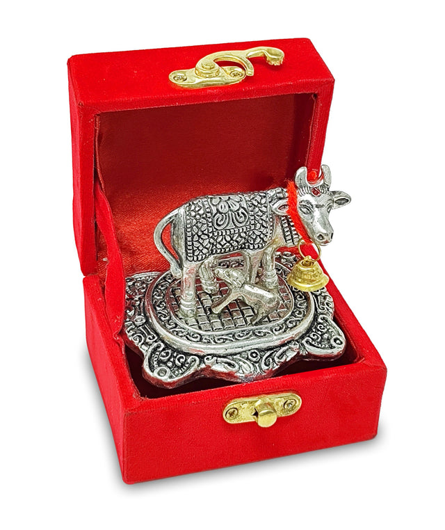 NOBILITY Small Kamdhenu Cow with Calf Metal Statue with Red Gift Box Decorative Item Showpiece for Home Office Diwali Decoration Items Wedding Return Gifts