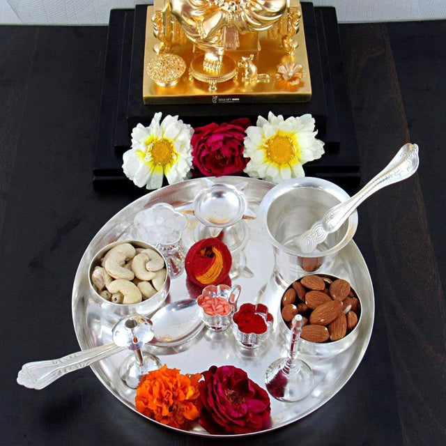NOBILITY Silver Plated Pooja Thali Set 8 Inch Puja Thali for Diwali Home Decorative Temple Office Wedding Return Gift Items