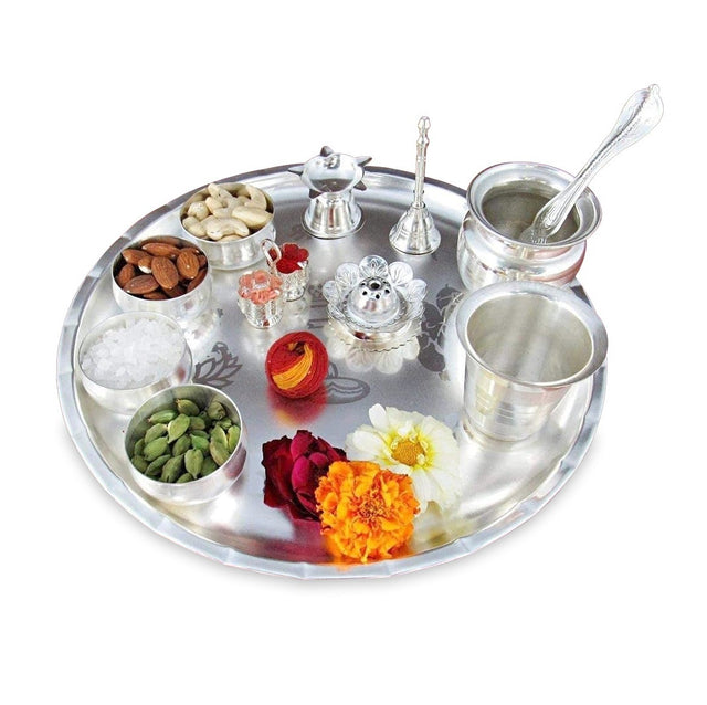 - π Nobility 12 Inch Pooja Thali Set in Silver Plated consists of an intricately designed Pooja plate, as well as, an assortment of items necessary for performing various religious rites during auspicious occasions