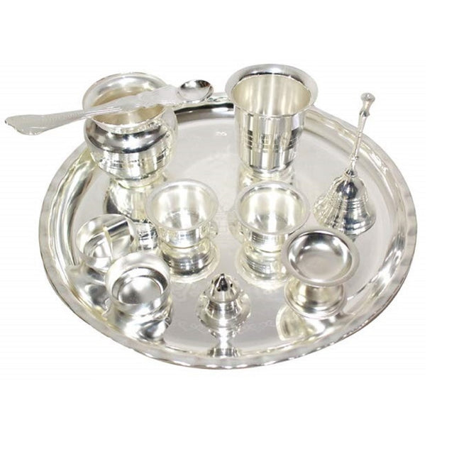 - π Nobility 10 Inch Pooja Thali Set in Silver Plated consists of an intricately designed Pooja plate, as well as, an assortment of items necessary for performing various religious rites during auspicious occasions