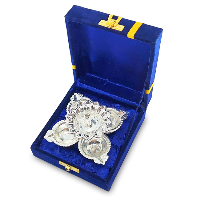 - The package Contains Panchmukhi Diya with Blue Velvet Gift Box. Material: 999 Silver Plated.