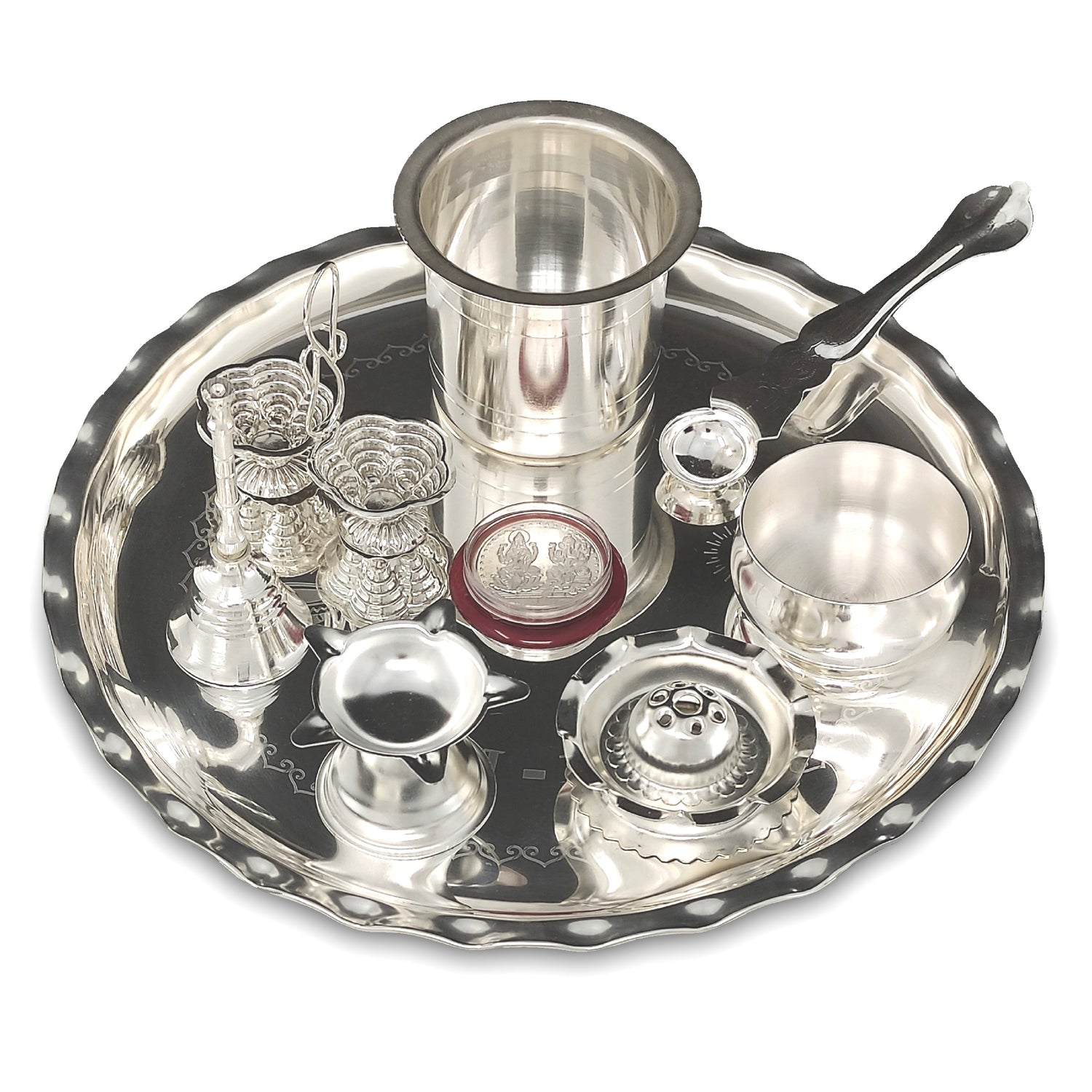 • 🎁 Nobility 9.5 Inch Pooja Thali Set in Silver Plated consists of an intricately designed Pooja plate, as well as, an assortment of items necessary for performing various religious rites during auspicious occasions