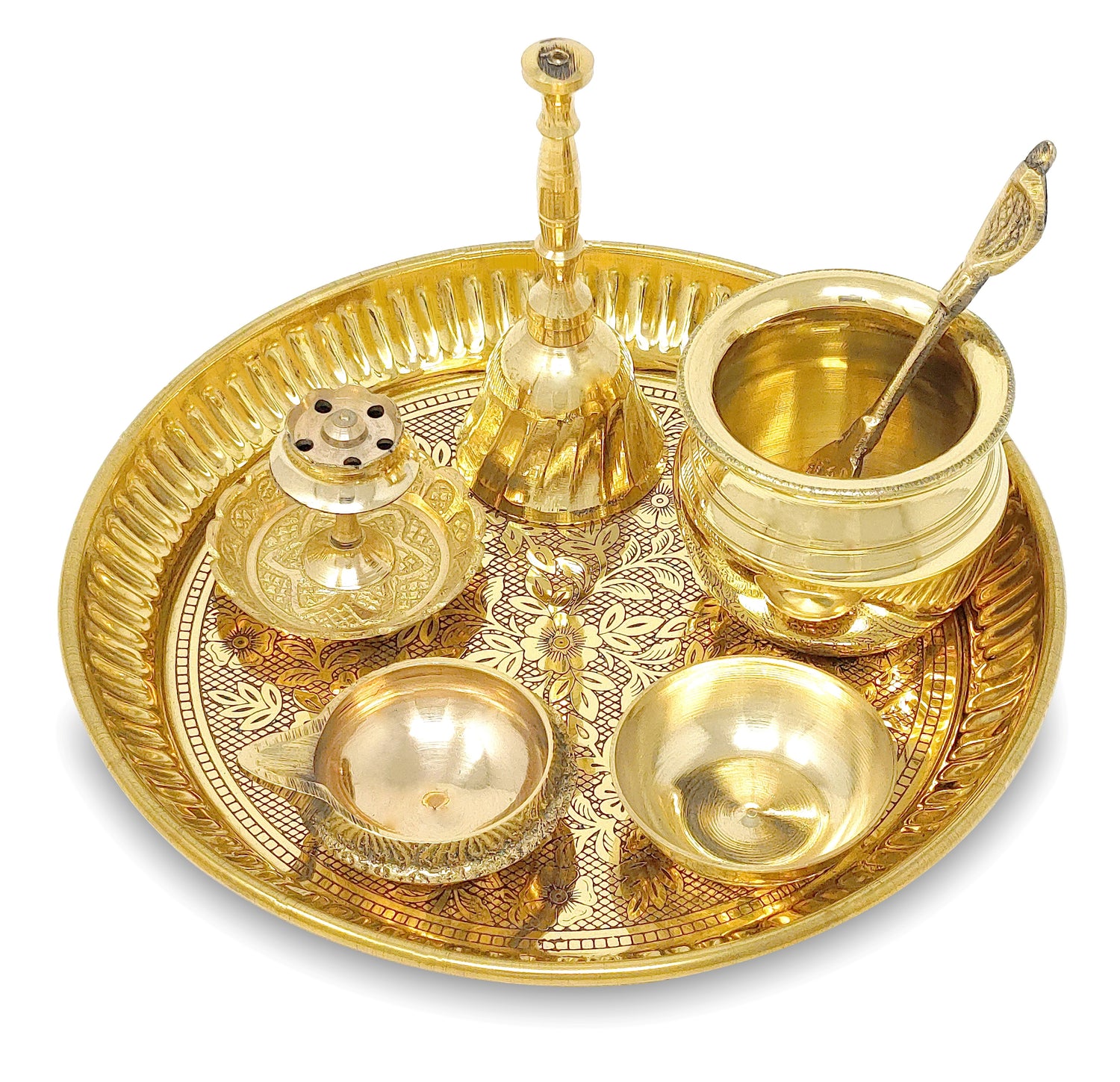 BENGALEN Brass Pooja Thali Set Small 6 Inch Puja Thali with Pital Plate Kalash Kuber Diya Chandan Wati Agarbatti Stand Ghanti Palli Arti Thali for Diwali Home Office Mandir Wedding Return Gift Items