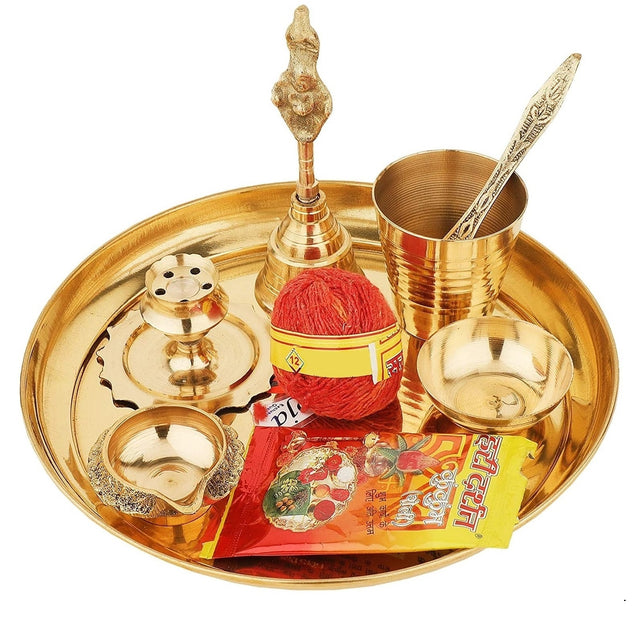 • 🎁 Nobility Pooja Thali Set in Pure Brass consists of an intricately designed Pooja plate, as well as, an assortment of their items necessary for performing various religious rites during auspicious occasions